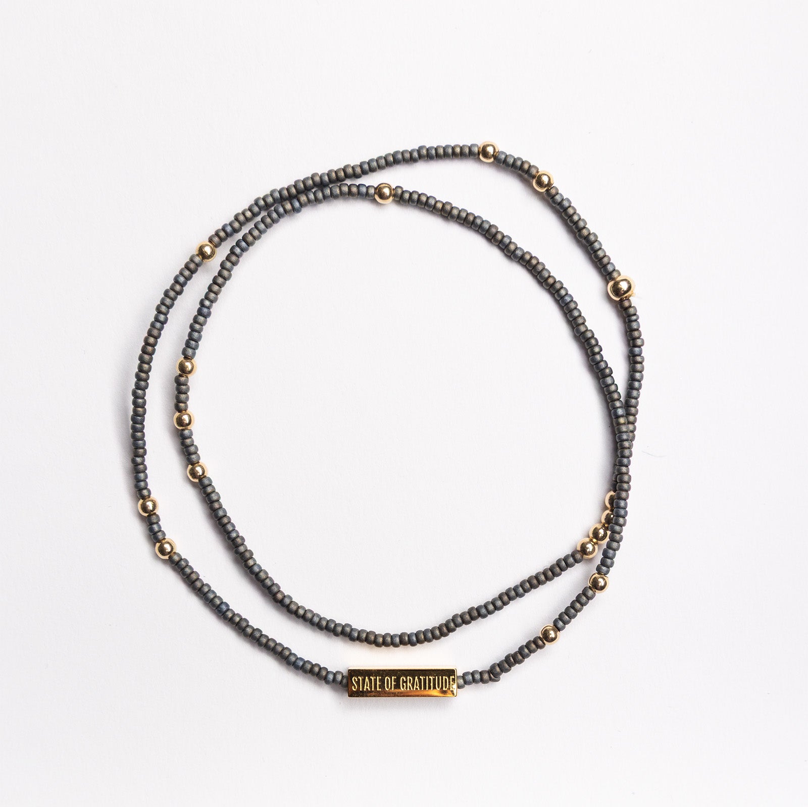 Finished with our engraved gold bar charm reading STATE OF GRATITUDE, sealed with a protective polymer coating to help prevent tarnishing.